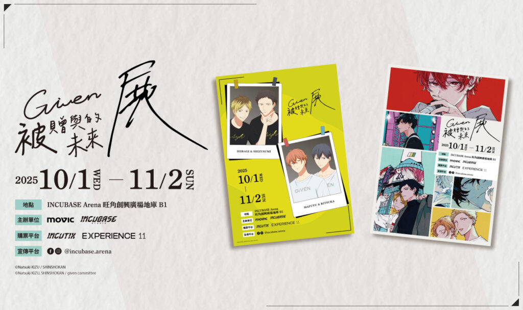 The emotionally resonant BL masterpiece “GIVEN”, beloved by fans across Asia, is set to make its Hong Kong debut following highly successful runs in Japan and Korea. As the second stop of its overseas tour, the exhibition takes place from October 1 to November 2 at INCUBASE Arena, Hong Kong, inviting fans to revisit a moving story of youth, friendship, love, dreams, and unspoken regrets. To commemorate this special occasion, original manga creator Natsuki Kizu will personally visit Hong Kong on October 18 to host her first-ever overseas signing event. This rare appearance offers fans a once-in-a-lifetime opportunity to meet the creator behind “GIVEN” and celebrate the series’ enduring emotional impact.
