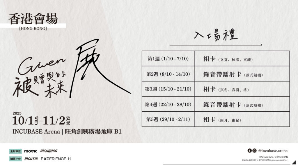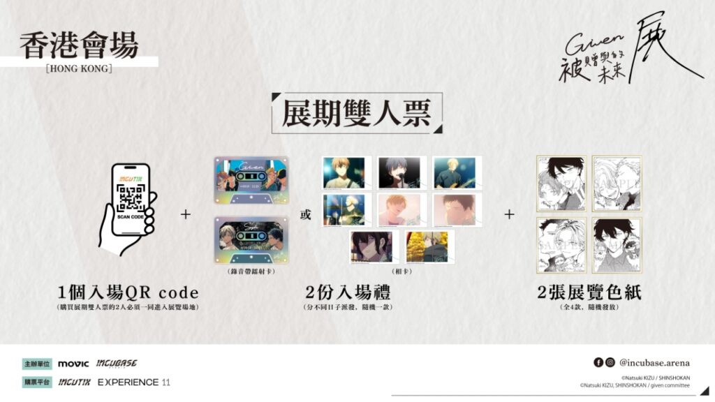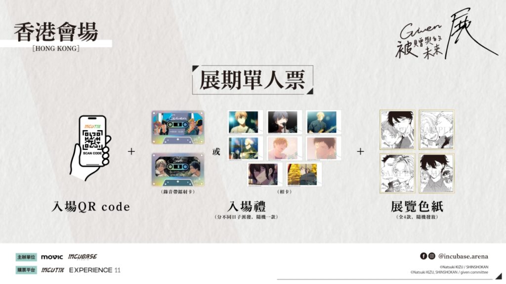 Created by manga artist Natsuki Kizu, “GIVEN” is a critically acclaimed BL series centered on a youth rock band, portraying stories of love, loss, and the pursuit of dreams among the members of “GIVEN” and “syh.” Serialized in Cheri+ from 2013 to 2023, the series expanded into a TV anime in 2019 and an animated feature film in 2020. The franchise continues to resonate with fans across Asia and welcomed a new manga spin-off, “GIVEN 10th mix”, in 2025. Originally launched as a touring exhibition in Japan in 2024, the exhibition officially expanded overseas this year. Brought to Hong Kong by INCUBASE Studio, the show marks its second overseas stop, reigniting the emotional journey that has captivated fans worldwide.